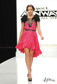 Kenley’s creation was whimsical and wonderful, as I knew it would be. The judges had some concerns with the construction, and they did have a point. I wish that the neck wouldn’t have plunged as far as it did. If it hadn't have gone down as far as it did, the dress would looked much better in the construction department. It was cool that she chose an animal print, but Miss Piggy wasn’t sure what message “pink giraffe” sent.